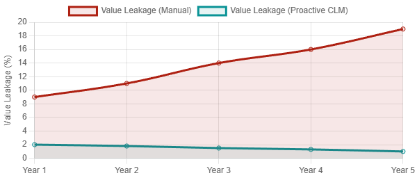 Contracts lose 9% of their value on average due to missed obligations. Proactive CLM uses automation to track milestones, deliverables, and compliance, actively preventing this value leakage over the contract's lifetime.